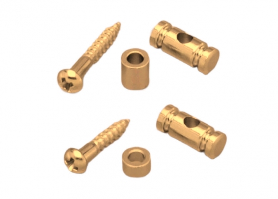 Gotoh® RG15 & RG30 gold barrel string retainers to apply downward pressure between the nut and tuning machine. Set of 1x low (2.5mm spacer) and 1x high (5mm spacer). Includes mounting screws.
