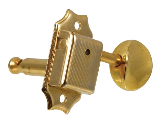3 per side Gotoh® SD90-05M vintage style tuning machines with 8.8mm press-fit bushings. Gold with metal oval buttons. (set of 6 keys = 3 right + 3 Left)