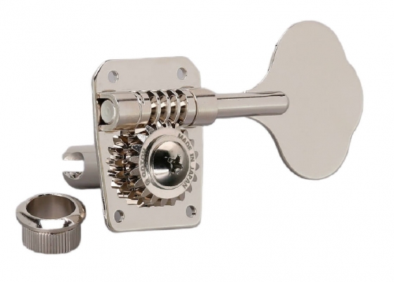 4x left side Gotoh® GB10 open back bass tuning machines with 15mm press-fit bushings. 'Left Side' tuners mount on the left side of the headstock when looking from the front on both right and left handed guitars. Nickel with metal cloverleaf ('elephant ear') buttons. (set of 4)